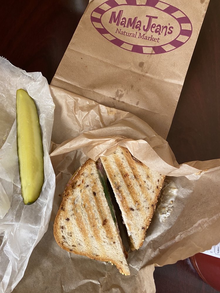 Mama Jean's famous tuna salad (tuna, mayonnaise, sharp cheddar cheese, peas, carrots, apple cider vinegar, agave, sea salt, cayenne pepper, and red onion) tomato slice and romaine lettuce - served on Turkey, bacon, swiss, avocado, pickled red onions, tomato, spinach and Dijon mustard - served on Honey Bronzed Wheat Bread.